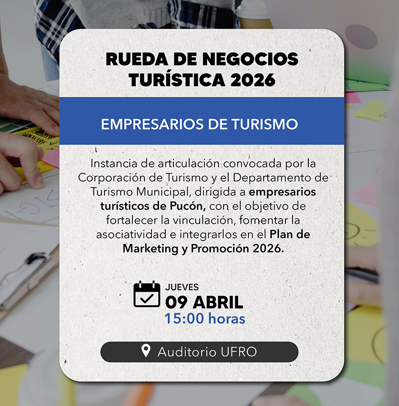 Instancia de articulación convocada por la Corporación de Turismo y el Departamento de Turismo Municipal, dirigida a empresarios turísticos de Pucón, con el objetivo de fortalecer la vinculación, fomentar la asociatividad e integrarlos en el Plan de Marketing y Promoción 2026.