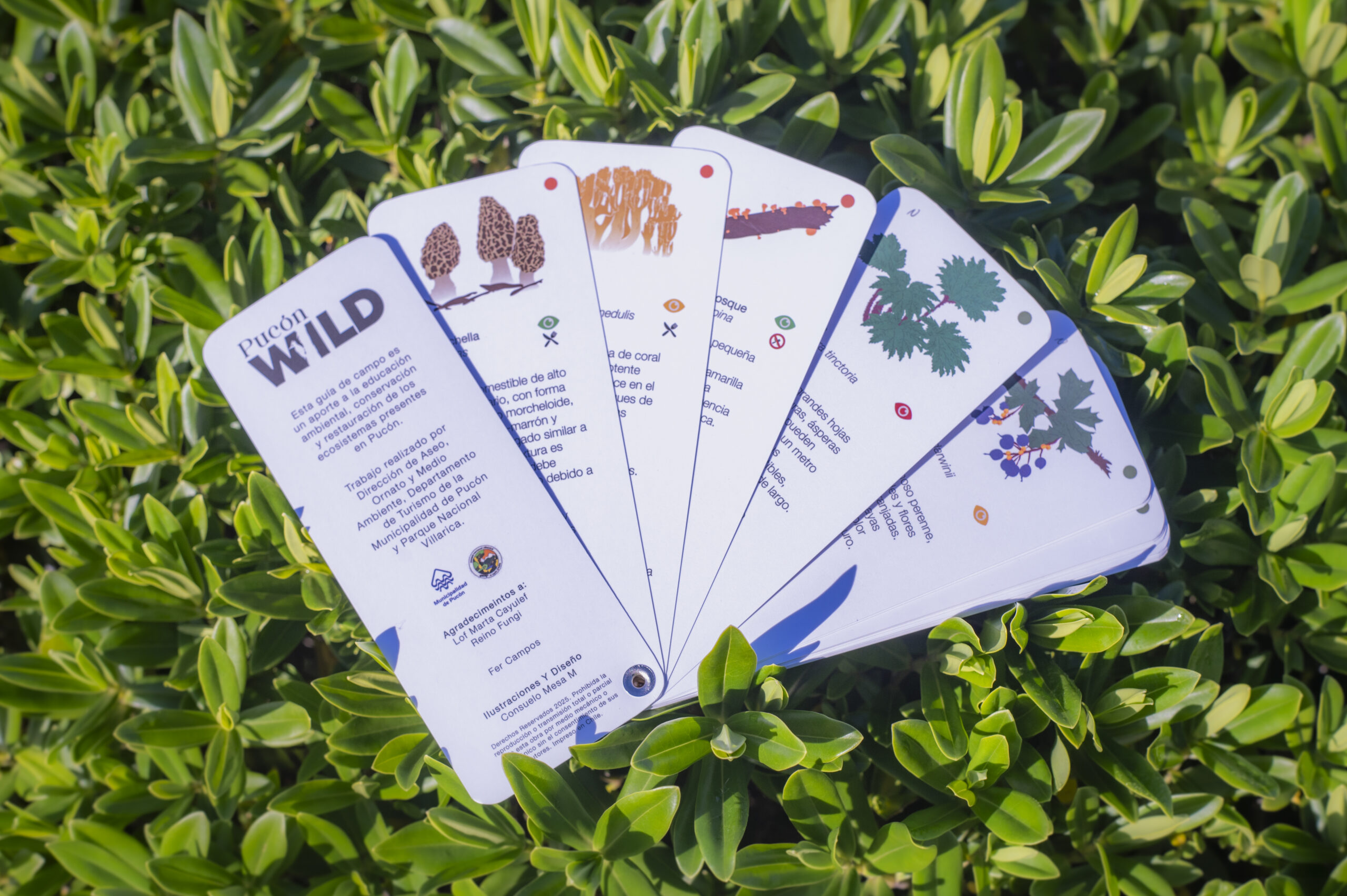 Una guía de campo en formato pequeño, tipo Pantone, pensada para llevar en el bolsillo, ideal para caminatas, clases al aire libre, rutas de naturaleza y experiencias de turismo regenerativo. En sus páginas, se despliegan fichas de 40 especies representativas de flora, fauna y fungi, con sus nombres en español, científico y mapudungun, acompañadas de información clave sobre hábitats, alimentación, tamaño y estado de conservación.